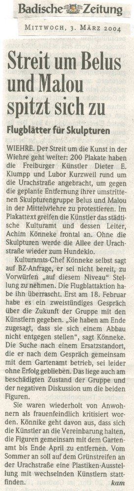 Schade, dass Herr Winkler, Vorsitzender des Bürgervereins, nicht klar bekennt, dass er gegen die Pläne des Kulturamtes ist. Als er nämlich als Reaktion auf einen Leserbrief einer unserer Freunde, Herrn Enders )kurz nach dessen Erscheinen im Herbst 2002) diesen anrief, sagte er im Gespräch, dass er persönlich die Entfernung von BELUS und MALOU gar nicht will. Wieso sagt er das nicht öffentlich?